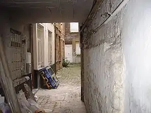 Au XVIIIe siècle on l'appelait parfois également "allée du Dragon de Fer"[2] car lors du bombardement de 1695, la maison du Dragon, située rue du Marché aux Fromages, avait été détruite et sur son emplacement ainsi que sur celui de la maison à sa droite appelée den Cleijnen Draeck appelée ensuite de Witte Roose, avait été construite en 1709 sur un grand terrain[3] une nouvelle belle et grande maison (een groote schone nieuwe huys) appelée "Den Eyseren Draeck" ou "Dragon de Fer" d'où pendait comme disent les wijckboecken un dragon de fer: "waer hangt een eyseren draeck"[4]. Cette vaste maison de maître située aux actuels n°15 et 17 a été entièrement défigurée en 1882 quand son rez-de-chaussée a été transformé en rez-de-chaussée commercial et sa façade déformée.