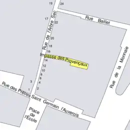 Au XIXe siècle, l'« impasse des Provençaux », ou « cul-de-sac des Provençaux », d'une longueur de 43 mètres, qui était située dans l'ancien 4e arrondissement, quartier du Louvre commençait aux 14-16, rue de l'Arbre-Sec et se terminait en impasse[2].