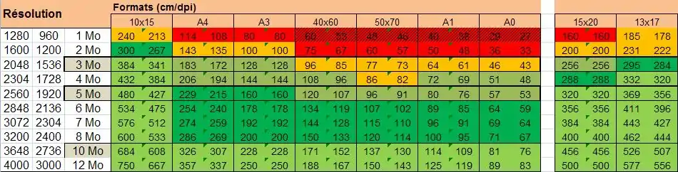 Ce tableau permet de comparer rapidement les possibilités d'impression selon la résolution numérique.