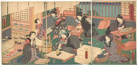 La manière dont les peintures et les gravures ont été réalisées, acquises et appréciées, requiert un éventail de participants à leur monde artistique : fabricants, éditeurs, mécènes, spectateurs, collectionneurs et autres[5]. Pour les peintures commandées, le modèle du monde de l’art peut sembler, à première vue, se résumer à la relation centrale du peintre et son client, mais il s’agit en fait de la collaboration de plusieurs autres personnes par exemple pour les matériaux (terres, pigments, encres, supports) dont la fabrication nécessitait une main-d’œuvre qualifiée[5]. Dans le cas des estampes, ces contributions étaient basées sur une division du travail appropriée qui permettait de réaliser le travail de manière efficace[6]. L’utilisation du terme « collaboration » peut sembler proposer un modèle d’échange entre égaux, mais il faut comprendre que dans ce cas le fait de travailler ensemble ne signifie pas nécessairement que chaque membre du groupe aurait eu un statut équivalent ou aurait eu un droit de regard égal sur le produit final[6]. Il est plus probable que cet effort ait contenu une dynamique de pouvoir explicite ou implicite qui a affecté les membres du groupe. Parmi ces participants, l’éditeur occupait une position clé dans le circuit de production et de réception[6]. Son rôle dépendait du fait qu’il était l’agent principal, qu’il fabriquait des œuvres par spéculation pour le marché, ou qu’il agissait comme coordinateur pour une commission[6]. Pour les imprimés destinés au commerce (y compris les feuilles, les livres populaires, etc.), l’éditeur évalue le marché et charge des ouvriers qualifiés de produire le contenu[6]. Il engageait des concepteurs et des écrivains pour réaliser les premières esquisses et rédiger les manuscrits, souvent selon ses directives[6]. Après avoir approuvé le contenu, l’éditeur engageait des sculpteurs pour réaliser les blocs de bois et des imprimeurs pour produire les œuvres imprimées à partir des blocs[6]. Ce processus s’appuyait sur la disponibilité d’une main-d’œuvre spécialisée et qualifiée et, bien que les cas individuels varient, chaque participant était rémunéré pour le travail effectué[6]. En organisant la main-d’œuvre pour ces projets, l’éditeur s’appuyait souvent sur la réputation des écoles, s’associait à des vendeurs éprouvés et tirait parti de l’expérience de l’école[6]. Le produit final était ensuite vendu au public par l’éditeur, avec la signature de l’artiste, le nom de l’éditeur et parfois l’adresse de l’éditeur[7]. Les graveurs sur bois et les imprimeurs restaient les artisans méconnus de l’impression sur bois japonaise[7]. Leur apprentissage était long, parfois allant jusqu’à dix ans[7]. Leur dévouement à leur métier était absolu, mais ce n’est que dans de très rares cas que leur nom apparaissait sur une estampe[7]. Le processus de création d’une œuvre de l’Ukiyo-e commençait avec l’artiste[7]. Il était chargé de produire un dessin ou une « image préparatoire », appelée shita-e, à l’encre noire sumi pour l’éditeur[7]. Parfois, l’artiste développait son dessin jusqu’à un très haut niveau de détail et d’exhaustivité[7]. D’autres fois, il fournissait un dessin plus sommaire, ne montrant peut-être que les contours de ses personnages et des suggestions pour l’arrière-plan[7]. Les détails étaient ensuite complétés par des par des copistes professionnels (hikko), ou même par des étudiants avancés[7]. Le hikko créait alors un calque ou « image de base » (hanshita-e) sur un papier translucide très fin, qui était ensuite transmis au graveur de blocs pour l’étape suivante — le transfert du dessin sur la planche de bois[7].