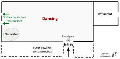 Ils déposent le , deux jours avant de créer la société d'exploitation du futur dancing[1], un permis de construire, sur un terrain au bord de la route nationale 520 (devenue route départementale en 1972), à environ deux kilomètres du centre de Saint-Laurent-du-Pont et de la commune limitrophe de Saint-Joseph-de-Rivière[4]. Il s'avère qu'ils ont déjà commencé les travaux depuis un mois. Leurs idées changeant avec le temps, le lieu terminé n'a plus grand-chose à voir avec le permis de construire qui a été accordé[1]. Le maire Pierre Perrin ne contrôle jamais les travaux et le préfet n'envoie jamais de commission de sécurité sur place[5].