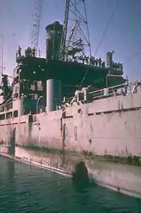 Alors qu'il faisait face à des tirs provenant du Liberty, le commandant Oren demande à plusieurs reprises la permission au quartier général de la Marine de riposter et le contrôleur naval en chef Izzy Rahav finira par lui accorder. Les tirs en provenance des vedettes israéliennes tuent le timonier du Liberty[42]. Les vedette-torpilleurs tirent au total cinq torpilles en direction du Liberty[44]. À 1235Z (14 h 35 heure locale)[42] une torpille atteint la coque du Liberty sur le bâbord, créant un trou d'un diamètre de 40 pieds (12 m) au niveau de ce qui était anciennement la soute et qui avait été convertie en espace de recherche, tuant 25 militaires, appartenant presque tous à la section du renseignement, et en blessant des dizaines d'autres[22],[45]. Il sera dit que la torpille avait frappé un cadre majeur de la structure de la coque qui a absorbé une grande partie de l'énergie ; des membres d'équipage affirment que si la torpille n'avait pas touché cette zone renforcée, le Liberty se serait brisé en deux et aurait coulé. Le Staff Sergeant de l'U.S. Marine Corps et spécialiste du russe, Bryce Lockwood dira par la suite : « Je ne pourrai jamais nier que Dieu maintient le Liberty à flot[trad 15],[7] »(trait d'esprit qui joue sur le nom du navire, Liberty signifiant « liberté »). Les quatre autres torpilles manquent leur cible.