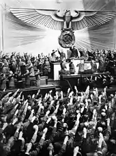 Gordon relève que les dirigeants nazis ont employé trois stratégies pour diffuser une propagande de haine contre les Juifs : les déclarations par les chefs nazis, l'instauration du ministère de l'Éducation du peuple et de la Propagande du Reich et la destruction de la presse indépendante[57]. L'historien américain Jeffrey Herf estime que le rôle des euphémismes dans la propagande nazie est surestimé puisqu'en réalité, les chefs nazis formulaient souvent des menaces explicites contre les Juifs[58]. Le dictateur allemand Adolf Hitler était le principal propagandiste nazi[57],[59]. Ses discours et ses déclarations contre les Juifs étaient diffusés à la radio et imprimés en première page de l'organe de presse du parti, le Völkischer Beobachter, ainsi que dans d'autres journaux à grand tirage[60],[59]. Le ministère de la propagande de Joseph Goebbels parvient à s'assurer « la mainmise intégrale sur les médias de masse » et, à partir du 4 octobre 1933, tous les médias indépendants doivent rendre compte au syndicat du Reich pour la presse d'Otto Dietrich, qui censure les rédacteurs qui ne suivent pas l'idéologie nazie ou leur inflige des amendes[61].