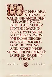 La propagande nazie diffusait la théorie d'un complot juif international qui contrôlait les Alliés et avait enclenché la Seconde Guerre mondiale pour « bolchéviser » le monde ; l'Allemagne, elle, se défendait par une « guerre contre les Juifs »[62]. Les propagandistes nazis accusaient régulièrement la « juiverie internationale » de conspirer pour l'extermination (Ausrottung) ou l'anéantissement (Vernichtung) des Allemands ; ils menaçaient d'agir de même envers les Juifs[63],[64]. À titre de « preuve », la propagande ne cessait de mentionner un livre obscur et auto-publié aux États-Unis : L'Allemagne doit disparaître ! (Germany Must Perish!), qui plaidait pour la stérilisation obligatoire de tous les Allemands[65]. La « prophétie de Hitler (en) », qui s'inscrivait dans un discours de 1939 où il imputait aux Juifs la responsabilité de la guerre et où il annonce leur destruction si elle éclatait, est citée maintes fois pendant les massacres de Juifs et elle fait partie des arguments à l'appui du génocide[66]. Les Juifs d'Europe étaient présentés comme une « cinquième colonne » et comme des saboteurs qui menaçaient gravement les efforts de guerre allemands, ce alors même qu'avaient lieu des déportations en masse vers les camps d'extermination[67].