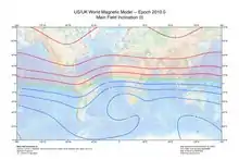 L'inclinaison magnétique d'un lieu est l'angle que font les lignes du champ magnétique terrestre avec l'horizontale. Elle se mesure avec un instrument particulier appelé boussole d'inclinaison. Elle est maximale aux pôles magnétiques et minimale à l'équateur magnétique. Comme la déclinaison magnétique, elle varie en un lieu au cours du temps. Les lignes de même inclinaison sont appelées isoclines[1].