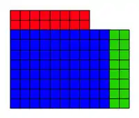 La figure de gauche possède à la fois la bonne aire et le bon périmètre, mais ce n'est pas un rectangle. On considère la bande, illustrée en rouge sur la figure de droite. Elle est exactement de la même dimension que le rectangle vert de la même figure. Retrancher la zone rouge et ajouter la zone verte ne modifie ni le périmètre ni l'aire de la figure.
