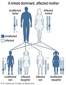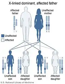 Transmission par le père d'un caractère dominant lié à l'X. Toutes les filles sont dans le cas général touchées. Dans le cas de l'IP, elles le sont seulement si les tissus reproducteurs du père sont porteurs d'où l'intérêt de l'analyse de sperme.