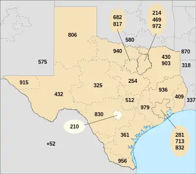 Carte de l'État du Texas avec les territoires de ses indicatifs régionaux. L'indicatif régional 210 est en blanc.