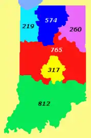 Carte de l'État de l'Indiana avec les territoires de ses indicatifs régionaux. L'indicatif régional 219 est en turquoise.