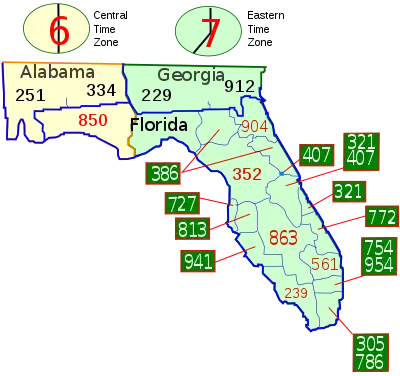 Carte de l'État de la Floride avec les territoires de ses fuseaux horaires et de ses indicatifs régionaux.