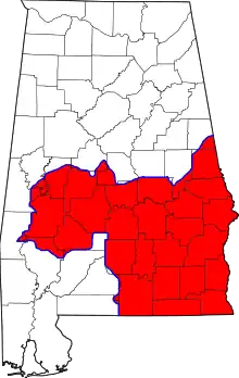 Carte de l'État de l'Alabama avec la région desservie par l'indicatif 334 en rouge.