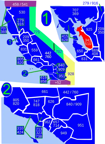 Carte de l'État de Californie avec les territoires de ses indicatifs régionaux. L'indicatif régional 510 est en rouge.