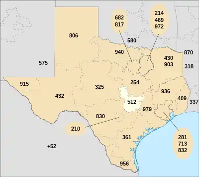 Carte de l'État du Texas avec les territoires de ses indicatifs régionaux. L'indicatif régional 512 est en blanc.
