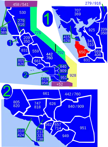 Carte de l'État de Californie avec les territoires de ses indicatifs régionaux. L'indicatif régional 650 est en rouge.