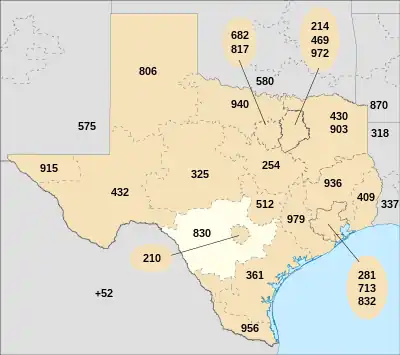 Carte de l'État du Texas avec les territoires de ses indicatifs régionaux. L'indicatif régional 830 est en blanc.