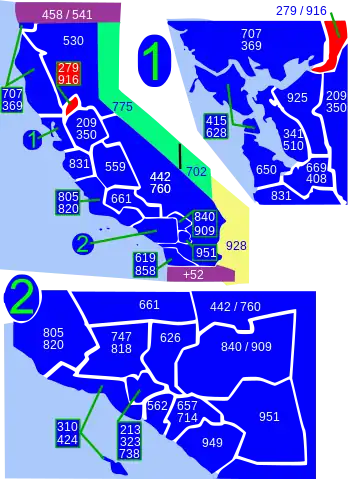 Carte de l'État de Californie avec les territoires de ses indicatifs régionaux. L'indicatif régional 916 est en rouge.