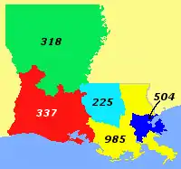 Carte de l'État de Louisiane avec les territoires de ses indicatifs régionaux. L'indicatif régional 985 est en jaune.
