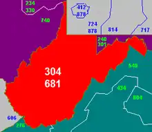 Les indicatifs régionaux 304 et 681 sont les indicatifs téléphoniques régionaux qui desservent l'État de la Virginie-Occidentale aux États-Unis.