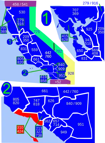 Carte de l'État de Californie avec les territoires de ses indicatifs régionaux. Le territoire desservi par les indicatifs régionaux 310 et 424 est en rouge.