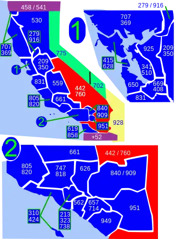 Carte de l'état de Californie avec les territoires de ses indicatifs régionaux. Le territoire desservi par les indicatifs régionaux 442 et 760 est en rouge.