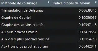 En règle générale, plus une méthode de voisinage va accorder de voisins aux entités, moins l'indice de Moran sera élevé. Le fait d'augmenter le nombre de voisins par observation augmente la probabilité d'obtenir des observations hétérogènes dans le voisinage, ce qui a pour conséquence une autocorrélation spatiale moins visible (surtout pour les indices globaux). Le choix de voisinage a donc une importance certaine dans l'identification de l'autocorrélation spatiale.