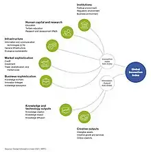 L'indice est calculé en prenant une simple moyenne des scores de deux sous-indices, l'Innovation Input Index et l'Innovation Output Index, qui sont composés respectivement de cinq et deux piliers. Chacun de ces piliers décrit un attribut de l'innovation, et comprend jusqu'à cinq indicateurs, et leur score est calculé selon la méthode de la moyenne pondérée[3].
