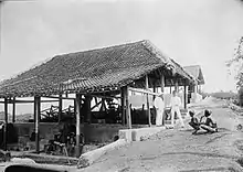 Aux Antilles au XVIIe siècle, les installations de production d'indigo (ou indigoteries) étaient constituées d'au moins trois bassins, disposés en marche d'escalier[18],[19],[20]. Une alimentation en eau par un ruisseau d'eau claire (ou un puits), permet de remplir d'eau le bassin supérieur (7, la trempoire). Les indigotiers coupés avant la floraison y sont mis à macérer de 6 à 20 heures. Une fermentation se produit qui dégage une odeur extrêmement nauséabonde mais qui permet néanmoins l'hydrolyse de l'indican (indoxyle β-D glucoside) en indoxyle et en glucose. En ouvrant une bonde, on laisse le liquide qui a solubilisé l'indoxyle s'écouler dans le second bassin (8, la batterie). On ajoute de la chaux à ce liquide de couleur jaune verdâtre et on l'agite pour faciliter oxygénation. Les molécules d'indoxyle se dimérisent (se lient deux par deux) pour former l'indigo (ou indigotine), le pigment insoluble d'une belle couleur bleue. Tout l'art de l'indigotier est d'évaluer la durée exacte de ce processus d'oxydation : trop court, le bassin perd du pigment, trop long, la teinture est altérée et se noircit. Pour récupérer le pigment bleu qui va précipiter au fond, on laisse s'écouler le mélange dans le troisième bassin (9, le reposoir), au fond duquel s'ouvre une petite cuve ovale qui récupère l'indigo alors que le liquide est évacué. La bouillie récupérée est mise à égoutter dans des sacs de toile puis à sécher dans des petits caissons en bois pour obtenir des blocs d'indigo prêts à l'exportation.
