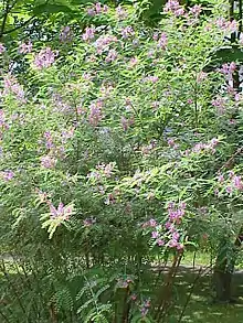 La feuille imparipennée comporte de neuf à treize folioles. Les folioles sont opposées, obovales à elliptiques, jusqu'à 25 × 12 mm, à poils clairsemés en dessous. Le pétiole et le rachis (7 cm de long) sont couverts de poils apprimés et creusés d'un sillon sur la face supérieure. Les stipules sont petites (2 mm), étroitement triangulaires.