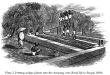 Contrairement à l'Amérique, les travailleurs n'étaient pas réduits en esclavage mais l'organisation du travail les forçaient à s'endetter puis à travailler dur pour tenter de rembourser leurs dettes. La culture des indigotiers était assurée par les petits paysans (ryots) qui n'étaient pas propriétaires mais devaient louer les terres d'un grand propriétaire foncier zamindar, de la noblesse terrienne. Lui-même était lié par contrat aux planteurs anglais qui fabriquaient l'indigo et s'engageaient à le fournir aux Agency Houses, des compagnies de négoce. L'organisation obligeait les paysans à produire de l'indigo plutôt que du riz puis à le vendre à un prix si bas qu'ils restaient endettés à vie[27]. Le système était très impopulaire et ceux qui le contestaient avaient affaire aux bâtons des nervis au service des planteurs et des zamindars[44]. Un gouverneur adepte des Lumières, compara la situation de ces travailleurs libres à celle des esclaves de Caroline (États-Unis). Même en Inde, l'aptitude à supporter les injustices a des limites et la révolte finit par éclater en 1859. Quelques planteurs furent jugés publiquement et exécutés. Quelques dépôts d'indigo furent incendiés. La révolte fut durement réprimée par les forces britanniques. Et l'année suivante, le gouvernement introduisit des réformes pour remédier aux plus graves injustices du système productif.