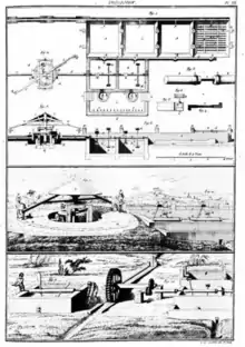 6 réservoir d'eau claire, 7 trempoire, 8 batterie, 9 reposoir.