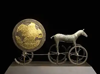 La culture proto-indo-européenne se caractérise également par la domestication du cheval, l'usage de la roue et de chars à bœufs. Le proto-indo-européen contient au moins cinq mots qui se réfèrent à la roue, ce qui témoigne de l'importance de cet objet dans la culture proto-indo-européenne[99]. On retrouve plus de 2 500 chariots dans la zone des plaines pontiques et de la mer Noire et la mer Caspienne entre 3500 et 3000 avant J.-C., région appartenant à l'espace de la culture kourgane[100]. La maîtrise du cheval qui se retrouve notamment chez les Hittites et l'usage de chariots à bœufs permettra la diffusion de la culture Yamna sur l'espace eurasien[101].