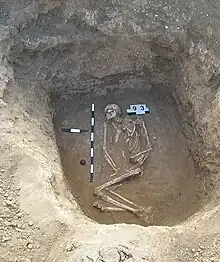 Les principaux vestiges de cette civilisation, des tombes à tumulus nommées « kourganes », indiquent qu'il s'agissait d'une société patriarcale et hiérarchisée[93]. En effet, ces kourganes sont des tombes collectives, ce qui laisse supposer une immolation des proches (femmes et serviteurs) en cas de décès du maître, pratique retrouvée aussi bien dans l'Inde des brahmanes que chez les Mérovingiens[94]. Le système indo-européen était également patrilinéaire (ascendance paternelle déterminante) et probablement patrilocal (la femme venant habiter dans la famille de son mari)[95].