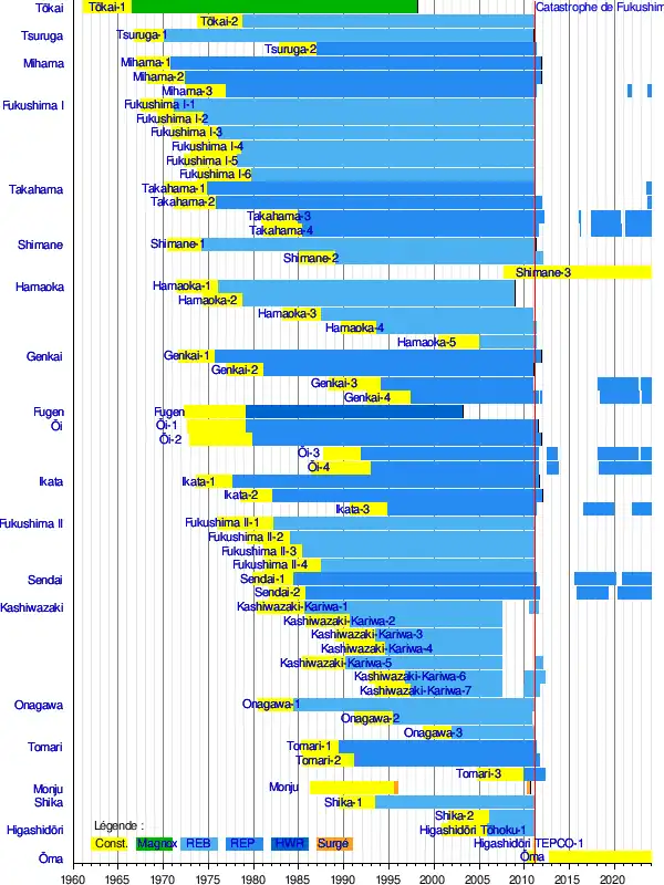 En mars 2020, sur les 54 réacteurs, il y avait 42 réacteurs opérationnels, mais seuls 9 réacteurs répartis dans 5 centrales produisaient de l'électricité. Au total, 24 réacteurs sont programmés pour être déclassés ou sont en cours de déclassement. D'autres sont en train d'être réactivés, ou subissent des modifications visant à améliorer la résilience face aux catastrophes naturelles. Les objectifs énergétiques du Japon pour 2030 prévoient qu'au moins 33 d'entre eux seront réactivés à une date ultérieure.