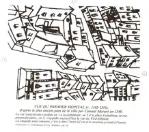 - Écusson de l’hôpital de Strasbourg au XIVe siècle, il orne la couverture d’un Obituaire de l’hôpital. Il contient dans un calendrier liturgique tous les legs et donations, messes anniversaires, distributions d’aliments, rentes viagères, etc., faits au profit de l’hôpital.