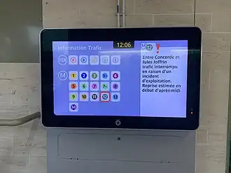 - À partir de 2014, le déploiement des écrans s'est poursuivi, et l'ensemble des écrans ont été raccordés à un nouveau système d'information ; ce système gère les informations multi-transporteurs et présente un nouveau service informant sur l'état général du trafic sur les réseaux RATP.