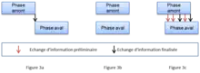 Une approche pour accélérer l’ensemble du processus de développement de produit serait de découpler les tâches à réaliser, sans échange d’information entre les phases, et de les faire en parallèle (figure 3b). Pourtant, ce type d’organisation nécessiterait de profondément modifier les étapes et/ou l’architecture du produit. Une approche alternative serait de faire chevaucher les étapes entre elles en augmentant la fréquence des échanges d’information entre étape en amont et étape en aval[5] (figure 3c). Dans l’ingénierie concourante, les équipes s’organisent en parallèle pour faire avancer le projet. Une métaphore couramment utilisée pour décrire le CE est celle de l’équipe de rugby organisée en ligne pour faire progresser le ballon alors que l’organisation des activités en séquence s’apparenterait plus à une course de relais, le jalon étant transmis successivement entre coéquipiers[6]. Ici, le point essentiel est la façon dont les échanges d’information ont lieu. Afin que les activités puissent se réaliser de manière concourante, l’information est décomposée et fournie le plus rapidement possible aux processus en aval afin que ceux-ci puissent démarrer le plus tôt possible, quitte à devoir faire évoluer le processus aval lorsque des informations complémentaires sont fournies par l’activité en amont.