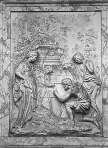 Le monument a été construit entre 1748 et 1763. Il a été commandé par Thomas Anson, payé par son frère, l'amiral George Anson, et façonné par le sculpteur flamand Peter Scheemakers. La copie en relief de la peinture de Poussin est contenue dans une arche rustique, et montre une femme et trois bergers, dont deux pointent vers une tombe. Sur la tombe est gravé le texte latin Et in arcadia ego (« Je suis aussi en Arcadie » ou «Je suis, même en Arcadie »). La sculpture présente un certain nombre de petites modifications de la peinture originale ; un sarcophage supplémentaire a été placé au-dessus de la tombe principale. Au-dessus du relief se trouvent deux têtes de pierre, l'une d'un homme chauve souriant, l'autre présentant une ressemblance avec le dieu grec Pan.