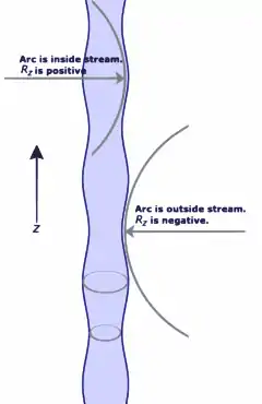 Néanmoins, l’équation de Laplace-Young est influencée par deux types de rayons différents. Un est le rayon de l’écoulement lui-même, comme déjà discuté. L’autre est le rayon de courbure de l’onde elle-même. Les arcs épousant l'écoulement sur le diagramme montrent deux valeurs du rayon de courbure au niveau des sommets et des creux. On observe que le rayon de courbure au niveau du creux est en vérité négatif, ce qui signifie, d’après l’équation de Young-Laplace, qu’il contribue en fait à la diminution de la pression dans le creux. De manière analogue, le rayon de courbure au niveau du sommet est positif et augmente la pression dans cette région. L’effet de ces contributions s’oppose à l’effet lié au rayon de l’écoulement lui-même.