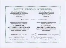 - Troisième degré - Certificat d'études supérieures (Atesto pri Supera Lernado). Il peut être complété par un ou plusieurs certificats de capacité (Atesto(j) pri Kapableco), choisis dans la liste ci-dessous (liste susceptible de se compléter dans le futur[Passage à actualiser]) :