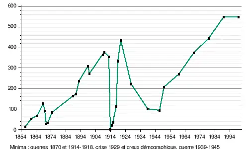 Cependant des mutations du tissu industriel[N 6] commencent à se dessiner vers 1960[8], dues à la croissance de l'usage des hydrocarbures pétroliers et à la réduction de la part du charbon dans la demande française d'énergie primaire, à l'épuisement du stock de charbon exploité de manière rentable dans les houillères du bassin du Nord et du Pas-de-Calais, à la transition vers l'énergie décarbonée non dépendante des hydrocarbures au travers d'un programme de centrales électronucléaires lancé en 1970 et à la finalisation des grands aménagements hydroélectriques, puis en 1977 à l'arrêt d'investissement dans de nouvelles centrales thermiques alimentées au fioul ou au charbon pour produire l'électricité, tandis que le réseau de distribution de gaz de houille est converti au gaz naturel (gaz de Lacq et Groningue, puis de mer du Nord norvégienne notamment). Elles précèdent les premières crises énergétiques des transports dépendants de l'approvisionnement pétrolier (chocs de prix du pétrole de 1973 à 1985, avec un pic en 1979), l'effondrement du marché sidérurgique, les restructurations des secteurs mécanique automobile, carbochimique et pétrochimique, et une inflexion pérenne de la croissance des échanges économiques dans un contexte de stagflation jusqu'en 1986, tandis qu'émerge la conscience des pollutions et des dégâts irréversibles causés sur l'écosystème[9].