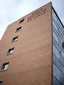 La décision du déménagement de l'IDN sur le campus de l'université de Lille, à 6 km au sud-est de la rue Jeanne-d'Arc, est prise le par le recteur Guy Debeyre, confirmée le par le ministère de l'éducation nationale, qui assigne à l'IDN les bâtiments initialement prévus pour un Institut national des sciences appliquées[A 7],[V 1], ce qui permet d'accroître la taille des promotions d'ingénieurs. Le déménagement initié en 1968 est quasi-achevé en ; les locaux de la rue Jeanne-d'Arc sont libérés en . Depuis 1968, les cours et la recherche sont assurés avenue Paul-Langevin sur le campus de l'université des sciences et techniques de Lille (cité scientifique)[59], où un ensemble immobilier de formation et de recherche et une résidence Camus (990 chambres de 9 m2) pour les élèves, construits entre 1965 et 1968 sous la direction des architectes Pierre Vivien et Pierre Eldin[60], sont étendus en 1988 et où une technopole scientifique pluridisciplinaire s'est constituée à proximité de l'École. Une nouvelle résidence Léonard de Vinci pour les élèves-ingénieurs est construite par Rabot Dutilleul en 1993, comprenant 581 lits dans des appartements individuels (18 à 20 m2) ou appartements doubles chambres (40 m2). Les élèves-ingénieurs étudient à proximité d’œuvres d'art, notamment des peintures sur toiles et des œuvres extérieures telles que des sculptures formées de modules en béton blanc[61] et un ensemble sculptural en inox et béton[62] de Pierre Brun, réalisées avant 1978, et des œuvres de Bruno Dumont datant de 1996[60].