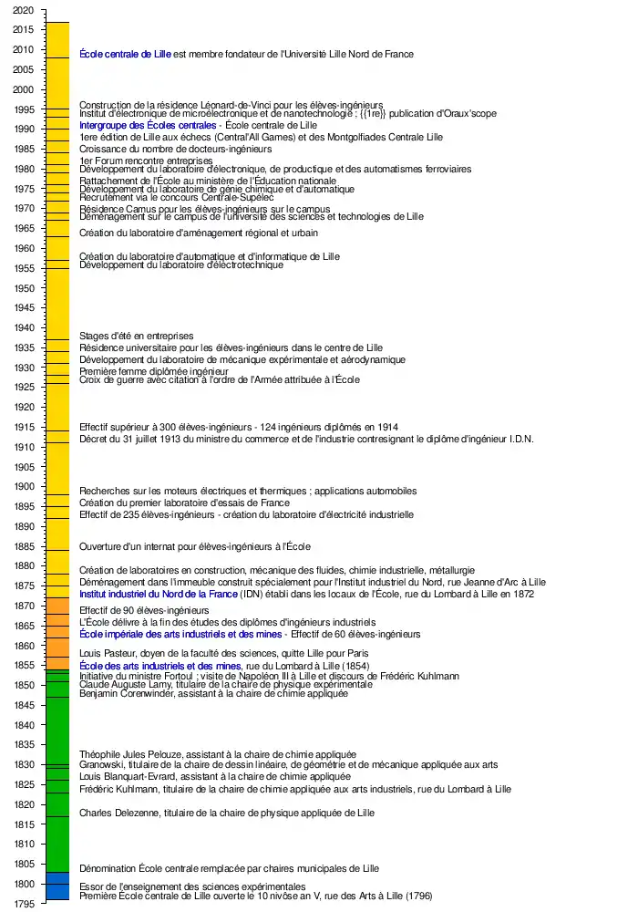 Depuis sa fondation en 1854, l'École a d'abord subi les événements consécutifs à la guerre franco-allemande de 1870-71[31], d'où découlent la réforme des études de 1872 et l'établissement de l'Institut industriel du Nord dans ses locaux[32].