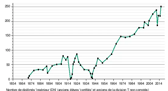 Après l'amalgame en 1926 des classes d'enseignement primaire supérieur et celles de collège et lycée, dont l'effectif réduit est consécutif au désastre démographique de la Grande Guerre, l'établissement de la gratuité de l'enseignement secondaire en France par la loi du favorise la démocratisation de l'accès à l'enseignement supérieur[97]. L'année préparatoire est supprimée en 1935 et le rôle est transféré aux classes préparatoires des lycées[98]. La sélectivité de délivrance du diplôme d'ingénieur IDN passe alors de l'aval, par des examens de sortie conditionnant la délivrance ou non du diplôme à une petite partie seulement de chaque promotion qui a suivi le cursus de trois ans et est déclarée apte à exercer les métiers d'ingénieurs (l'autre partie de la promotion d'élèves n'obtenant qu'un simple certificat pour leurs trois ans d'études), à une sélectivité scolaire amont par concours d'entrée national préalable au cursus de trois ans de formation et la délivrance du diplôme à la quasi-totalité de chaque promotion.