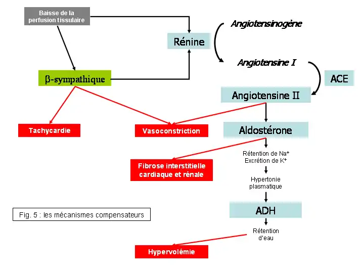 La baisse de perfusion rénale résultante de la baisse du débit cardiaque entraîne la sécrétion par l’appareil juxtaglomérulaire d’une hormone, la rénine. Cette hormone libérée dans le compartiment vasculaire clive l’angiotensinogène, un peptide inactif présent dans le plasma, en angiotensine I, prohormone également inactive. Dans les capillaires, l’angiotensine I entre en contact avec une enzyme transmembranaire située à la face luminale des cellules endothéliales, l'enzyme de conversion de l'angiotensine (ECA), qui la dégrade en angiotensine II, peptide vasoactif à l’origine d’une très forte activité vasoconstriction artérielle et veineuse, résultant en une augmentation de la précharge et de la postcharge. Dans un second temps, l’angiotensine II déclenche la sécrétion par la corticosurrénale d’une hormone minéralocorticoïde, l’aldostérone, qui agit sur le tube contourné distal en augmentant la réabsorption de sodium et l’élimination de potassium. L’hypertonie plasmatique résultante stimule d’une part la réabsorption d’eau et augmente ainsi la volémie (augmentation de la précharge et de la postcharge), et d’autre part contribue à activer la sécrétion de rénine, renforçant ainsi le SRAA. L’aldostérone a également une activité vasoconstrictrice directe, ainsi qu’un effet profibrotique (facteur de croissance) sur le cœur et le rein. Enfin, l’hypertonie plasmatique entraîne la libération par la neurohypophyse d’Hormone Anti-Diurétique (ADH), qui favorise la rétention d’eau et contribue ainsi à remonter la volémie et augmenter ainsi précharge et postcharge. Les effets de l’activation du SRAA sont donc une augmentation de la précharge et de la postcharge, par le biais d’une vasoconstriction et d’une hypervolémie.
