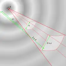 Quand la distance double, cette surface quadruple. L'intensité acoustique se divise donc par quatre, en champ libre, quand la distance à la source se multiplie par deux. Le niveau d'intensité acoustique diminue de 6 dB (décibels). De ce fait, l'intensité acoustique varie comme l'inverse du carré de la distance à la source sonore considérée :