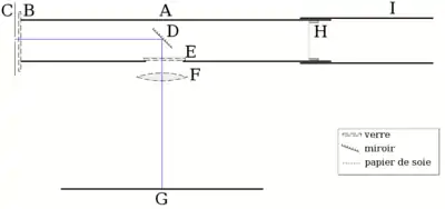 A. Tube de bronze fermé par la glace B obscurcie par la plaque C traversée par une fente illuminée par une lampe. D. miroir mobile suspendu par un fil de soie, rappelé à sa position par des petits aimants; c'est le disque sensible au mouvement acoustique de l'air. E. Fenêtre en verre. F. Lentile de projection de la ligne lumineuse sur l'écran G. H. lentille de papier de soie protégeant le miroir des courants d'air. I. portion de tube coulissant pour l'accord en fréquence[11].