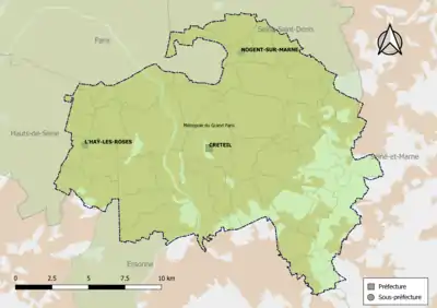 Le département du Val-de-Marne est intégralement compris sur le territoire de la métropole du Grand Paris depuis le [1]. Il est divisé entre trois établissements publics territoriaux : T10 (Paris-Est-Marne et Bois), T11 (Grand Paris Sud Est Avenir) et T12 (Grand-Orly Seine Bièvre).