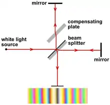 Pour corriger cela, on place sur le chemin du rayon violet et vert (c’est-à-dire légèrement en haut et à gauche de la séparatrice) une lame dite compensatrice qui doit être de même indice de réfraction et de même épaisseur que la séparatrice, parfaitement parallèle à celle-ci.