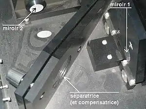 L'interféromètre de Michelson est constitué de deux miroirs et et d'une lame semi-réfléchissante appelée séparatrice. Il est possible de régler l'orientation des différents éléments à l'aide de vis micrométriques. De plus, les miroirs peuvent être translatés : l'un d'entre eux dispose d'une vis micrométrique pour ajuster précisément l'écart entre les miroirs.