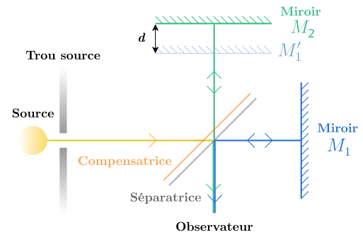 Sur le schéma ci-contre, qui modélise un Michelson utilisé en lame d'air, la source de lumière envoie un rayon (d'intensité ) vers la lame séparatrice. Ce rayon est divisé en deux rayons (bleu et vert) d'intensité . représente l'image du miroir par la séparatrice, donc symétrique par rapport à celle-ci. La différence de longueur des bras de l'interféromètre induit une différence de marche entre les deux rayons égale à .